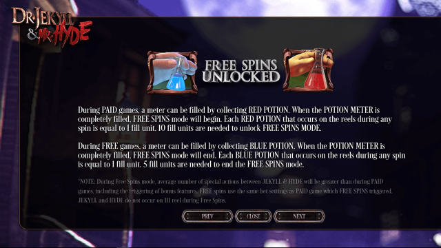 Солидные выигрыши приносит цепочка с изображением красной колбы и Джекилла, которые выпали в соседних ячейках. Они превращаются в особый Wild. Пиктограммы начнут перемещаться, чтобы сформировать максимальное количество призовых последовательностей.